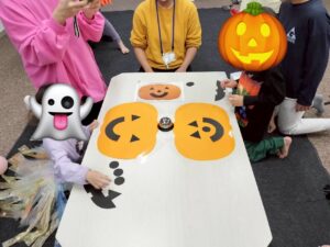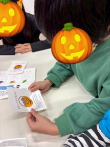最初は【かぼちゃの顔はどんなかお?】ゲーム!2チームに分かれてお手本通りに顔のパーツを並べるゲームです。 『頑張れー!そうそう!上手!』と応援する側も熱が入ります!