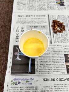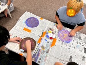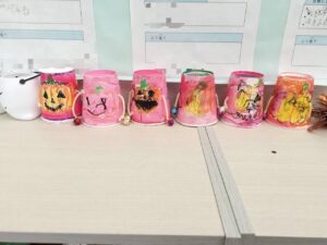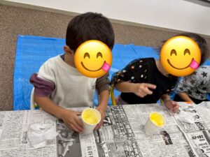 小さい子たちは紙コップにかぼちゃの絵を描いて絵の具ではじき絵をしでんでん太鼓風のかわいい飾りを作りました! 絵の具を筆で塗る作業も何度も経験しているのでとっても上手に塗れました🎵