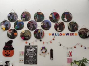 大きい子たちは段ボールの台紙に絵の具をスタンピングし猫のモチーフや飾りを付けて幻想的で素敵な作品を作りました!
