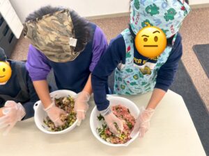 午前中からクッキングを開始して昼食の時間に出来上がるように大きい子から小さい子まで、全員しっかりと役割分担を決めて取り組みました。野菜を切り、隠し味もひと工夫しながら具材を混ぜてひとつひとつ一生懸命に餃子の皮で包んでいきました。