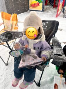 この日は雪が降る中でのデイキャンプでしたが、BBQの準備(テントやテーブル、イスなどのセッティング)と豚汁の下準備(人参、玉ねぎ、じゃがいもの皮むきと豚肉を切る)を子供たちに手伝ってもらったり、ぴゅあてぃに出来た雪山でみんなで楽しく思う存分雪を満喫しました。
